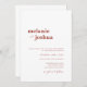 This simple, modern wedding invitation features a terracotta and white colour palette, a bold serif font for the couples' names, an elegant and classy sans serif font for the wedding invitation text, and a charming hand-written script font for a touch of extra elegance.