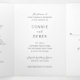 Elegant tri-fold all in one wedding invitation featuring a simple design with a modern sans serif font and an elegant script font. Attached RSVP card has meal choices for your guests.