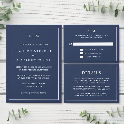 Simple navy blue and gold foil wedding RSVP card featuring a modern yet elegant design with your two letter monogram at the top and your details surrounded by a thin border. A chic and stylish design that is great for a minimalist couple.