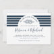 Simple nautical wedding invitation featuring the words "WE ARE TYING THE KNOT" curved over the top of a simple nautical knot. On the top, it features classic navy blue stripes on a white background with a clean, minimalist look. Perfect for yacht club, boat, beach side or summer weddings.