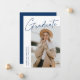Modern graduation announcement card featuring one of the graduate's photos on the front with "Graduate" in a navy blue handwritten script with a white background. Personalise with the graduate's name, school name, and graduation year. The minimalist graduation announcement reverses to display 4 photos in a grid-style layout with the graduate's future plans or other custom text shown below. The 5 photo graduation announcement is perfect for both high school and college graduates.