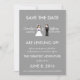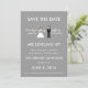 This fun and geek, yet simple and chic save the date wedding announcement features 8-bit bride and groom characters with purple accents gazing at each other against a silver grey background.