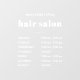 Simple and modern hair salon opening hours window cling features white typography and easily editable business hours text templates.