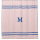 This pale pink shower curtain has two deep blue horizontal lines are across the top and bottom. A deep blue letter is in the centre. You can change the letter to display the correct monogram.