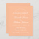 A simple engagement party invitation with a modern colour: peach. It has only white text on peach background. The names are written in an elegant calligraphic script, the rest in caps. the first line is arched text.