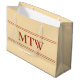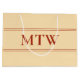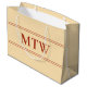 This peach gift bag has red text. You can edit it to show the correct monogram. Red lines are above and below the text.
