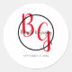 This design features an elegant yet simple arrangement of the bride's and groom's personalised initials. The couples names are encircled with a black ring and placed on top of the bride's and groom's first name initials which are displayed in red colour typography. This red, black and white design is simple yet elegant in every way. The combination of colours creates a sophisticated, trendy and chic style. Elegant wedding sticker design with modern elements. The simple setup of the typography gives it a distinct style. Matching wedding invitations and other stationery items are also available.