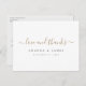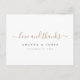 This simply chic wedding thank you postcard template features a crisp modern look. We've given this minimalist design a splash of panache with 'love and thanks' in a flowing modern font that manages to be both elegant and lively at the same time. We love the stylised, elongated flourish at both ends. To highlight this aspect of the design we've chosen an elegant gold tone sometimes called California Gold for the 'love and thanks' part of the design. You can easily edit the text to suit your taste, and you can change the font and colour of the text as well. You might for example chose another format for your names, such as 'Mr. and Mrs......' or your first names and last name, etc. or give a different colour to the 'love and thanks' script. We've chosen black and grey as the default setting for the other text on the front, and a grey tone for the text on the back. We've put some sample text on the back for you to replace with your own message as you see fit. But please don't feel restricted by this. If you prefer delete our sample text and then keep the message space on the back totally blank so that you can write a handwritten note on each card instead, you can do that. Or you might want to replace our text with your own message of gratitude and your own closing and then hand sign your names when you receive the cards. Just please be sure in any case to delete our sample/placeholder text on both sides of the card! The default background on the front is transparent so that the colour of the paper will simply serve as the base tone. On the back we've chosen a background hue that isn't quite white, it's a very light grey that's mostly white called White Smoke. You can change this by picking another colour in the editing tools, or perhaps you'd like to make it transparent as it is on the front. We hope you'll enjoy experimenting with various aspects of this thank you postcard's appearance according to your taste and make it uniquely yours with the intuitive design tools and your inspiration. And please browse our wedding thank you collection for a selection of elegant modern wedding thank you cards!