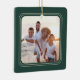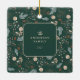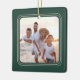 This simple family photo Christmas ornament offers space for a square photo against a dark burgundy background. The backside features a boho winter greenery pattern appearing in soft tans and teals on the same dark teal green background and offers custom text for your name and year.