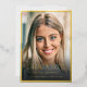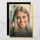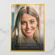 This is a modern and elegant high school graduation party invitation in real gold pressed foil using a simple but classic font along with a single minimalistic photo on the front with an elegant gold frame border. The reverse side includes a message that you can personalise, along with another photo. Please contact the designer for any queries related to this design.