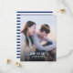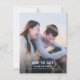 Minimalist style save the date photo with modern fonts. There is a gradient at the bottom of the photo, which is optional. The backside has blue and white stripes. Fonts and colour are customisable.