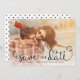 These simple photo save the dates feature charming hand-lettered calligraphy script. Overlaid on your photo with a white fade at the bottom (you can remove this if you don't need it via Zazzle's customise/personalise tool). A cute polka dot background finishes off the design!