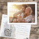 Announce your big day with this elegant save the date card designed as a wedding postcard. Perfect for couples seeking a budget-friendly option, this card features calligraphy script typography and a modern photo template. The minimalist simple layout highlights your love story with stylish elegance and minimal photography. Add a QR code for your wedding website to keep guests informed. A creative and chic way to set the tone for your special day!