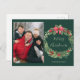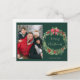Celebrate the season with this photo festive wreath Christmas holiday postcard. Replace the photo with your own. Green background with classic Christmas wreath. Light green text reads, Merry Christmas in the centre of wreath. Below the wreath you can personalise the text with your own name.