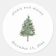 These rustic, winter holiday wedding stickers feature a green watercolor Christmas pine tree on a clean white background.