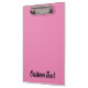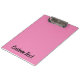 This pink clipboard has text in black script. The text can be edited or deleted.