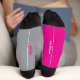 Mismatching socks in pink and grey. Odd socks in gray and pink. Text under the foot, if desired.