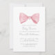 A cute and girly pink bow baby shower theme featuring an adorable baby pink watercolor bow. A simple and minimal classic baby shower look. Grey text in a mix of serif font and script typography. Celebrate the mum to be in style! You can change the font colours out to whatever you'd like. You can also change the background colour on the front and back. You can even change the colour of the white stripes that are on the back design. Simple Elegant Script Pink Bow Girl Baby Shower Theme Invitation With Pink White Stripes.
