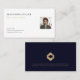 Make a lasting impression with our Simple Real Estate Agent Business Cards with Photo layout featuring a stylish typographic design on a clean white background with space for employee photo. The back features a modern gold geometric logo emblem with space for industry disclosures or custom text on a deep navy blue background, offering an elegant touch, perfect for real estate agents, property brokers, entrepreneurs, and any business professional looking to leave a lasting impression. Network with confidence and showcase your professional details.