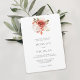 A lovely choice in floral wedding invitations, this custom design features a simple bouquet of watercolor botanicals in soft red and off white. Greenery and delicate floral accents add to the allure of the floral bouquet making this invitation a charming and romantic yet simple choice. An elegant type face pairing is used that has contemporary script elements blended with formal serif text. Personalise with your wedding details.