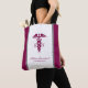 A nurse tote bag with a stylish red caduceus symbol with the letters R N on either side. Burgundy-magenta border with a black stripe along either side.
