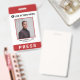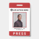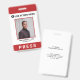 Basic photo ID badge in a vertical layout with a simple yet professional design featuring a red border on the top and bottom. The template is personalised with your logo, press publication name, employee name, and title. The bottom border has "PRESS" in large bold letters and may be changed to any title desired. The backside has your contact information and instructions for returning if found. This classic press pass is great for all news station field staff.
