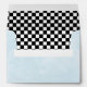 This fun race car envelope with the return address printed on the back flap with black and white chequered, 5x7, matching, blue, race car theme, with a minimal, and whimsical fun design.