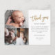 This Simple Script 3 Photo Collage Baby Thank You Card features modern gold handwritten calligraphy thank you and personal message on the front. Click the personalise button to customise this design with your photos and details.