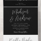 Modern wedding invitation featuring your monogram initials, names, and wedding details in a simple white script with a black background. The black and white all-in-one wedding invitation includes an RSVP postcard.