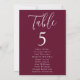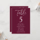 Modern wedding seating chart featuring "Table" displayed in a white script with the table number and guest names shown below on a burgundy background. The design repeats on the back. To order the table number seating chart, edit each card with the table number and guest names and add it to your cart. Designed to coordinate with our Simple Script wedding collection.