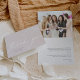 Simple and elegant folded thank you cards feature "thank you" in modern hand lettered calligraphy script on a soft pink taupe background. Personalise with your custom text beneath; shown with "from the future Mrs. [name]". Add a pre-printed personal message to the inside, as well as a photo from your event.