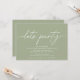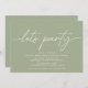 Simple, modern birthday invitations with heading text reading "let's party" in script. Add your event details below. White text on a sage green background.