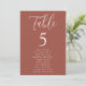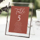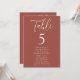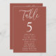 Modern wedding seating chart featuring "Table" displayed in a white script with the table number and guest names shown below on a rust background. The design repeats on the back. To order the table number seating chart, edit each card with the table number and guest names and add it to your cart. Designed to coordinate with our Simple Script wedding collection.