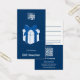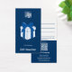 · Lower half: Blue background with white text, featuring a "Schedule!" CTA, customisable QR code, and the company's name, physical address, and virtual contact details.