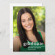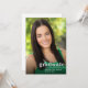 This simple, minimalist graduation card features a faux silver foil typography overlay and a full photo. The word "Graduate" is written in lowercase letters in bold, trendy lettering, with the graduate's name and graduation year below. The typography design is placed in the lower right corner and overlays a full photo with vertical orientation. The back of the graduation card includes a template to add graduation party details.