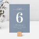 Simple Solid Colour Dusty Blue Wedding Reception Dinner Table Numbers. This modern chic Table Card is simple classic and elegant with a plain solid background colour and a pretty signature script calligraphy font with tails. Shown in the new Colorway. Available in several colour options, or feel free to edit the colours from within the editor (click customise further while personalising).