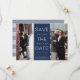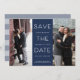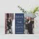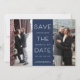 Modern save the date photo card features sans serif and italic lettering in crisp white, with your names, wedding date and location interspersed with "save the date." Text is centred on a rich navy blue background that bisects two of your favourite vertical or portrait orientated engagement photos. Personalise with your invitation info and/or wedding website along the bottom. A chic save the date choice for modern couples with a minimalist aesthetic.