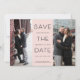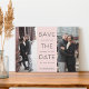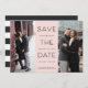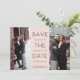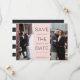 Modern save the date photo card in blush and black features sans serif and italic lettering, with your names, wedding date and location interspersed with "save the date." Text is centred on a pastel blush pink background that bisects two of your favourite vertical or portrait orientated engagement photos. Personalise with your invitation info and/or wedding website along the bottom. A chic save the date choice for modern couples with a minimalist aesthetic.