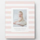 This simple design features white rugby stripes and a framed photograph with custom name and birth details.