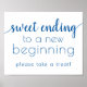 Modern cobalt princess blue and white flourish calligraphy horizontal "Sweet Ending to New Beginning" shower, party, or reception table signage featuring a fun, casual hand-lettered script. The classic design includes a modern handlettered quote typography overlay. The lovely font with a customisable background colour makes it easy to fit any theme. For other colours or matching products, please visit the JustFharryn Zazzle store, or contact the designer, c/o fharryn@yahoo.com All rights reserved. #zazzlemade