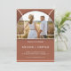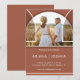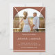 Simple and elegant terracotta and white photo arch with overlay wedding invitation.