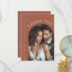 Your wedding guests will be so happy to receive this beautifully elegant wedding thank you card in earthy terracotta featuring a special photo from your wedding day. Simple, elegant and tasteful, this classic design features a thin line border along the left edge with the bride and groom's monogram initial. Lovely serif lettering spells out Thank You in curved text above the arch photo template. Replace the sample photo with your selected photo. The back of the card has a text template with a sample thank you message that you can use as written, or personalise with your own wording, along with the bride and groom's names.