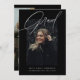Simple Trendy Calligraphy Photo Graduation Invitation features one photo on the front and two photos on the back along with graduation invitation details.