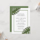 Modern wedding invitation featuring a simple design with two large green palm leaves, one in the upper left corner and one in the lower right corner and a frame surrounding your wedding details, over a white background. The backside is a matching shade of green. This tropical design is perfect for a summer destination wedding by the beach.