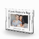 This simple, black and white Father's Day photo block for the first time father features a simple white background with black vintage typewriter text typography that says "First Father's Day." Add a photo of the new dad and the baby, with room to personalise with names and year.