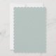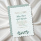 Blue green leaves wedding invitation template. Pale green paper with brown and blue-green text in two font styles. Names of the couple are in bold, blue-green handwritten script. A large and sign is behind the names and text. The printed text is brown, with a sprig of eucalyptus leaves along the bottom of the paper. The reverse contains a tiny pattern in the same blue-green colour. Scalloped edge is shown, with many other options, as well as paper upgrades.