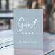 This design features wedding simple modern sign signage, guestbook guest book quote saying, minimalist minimal dusty blue, a reception guest bar tabletop sign, dusty blue minimalist minimal style, modern calligraphy script text font, an elegant trendy stylish typography font, an elegance simplistic reception guest sign, a guest book modern style, a custom customise reception signs