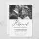 Elegant change the date wedding postponement announcement. This simple announcement is a chic way to let invited guests know that your wedding date has been rescheduled due to unforeseen circumstances, and includes the new wedding date. This trendy announcement features beautiful "postponed" black calligraphy script on a white background with the couple's photo, and a black back of the card.