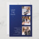 Simple Wedding Save The Date Photo Picture Invitations features four of your favourite photos, three on the front and one on the reverse with the text "Save the date" in elegant modern script typography on a blue shimmer background. Simple, modern and elegant for your wedding day celebration. Designed by ©Evco Studio www.zazzle.com/store/evcostudio