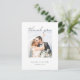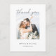 This simple, chic photo wedding thank you postcard template features a crisp, modern design. We've chosen a stylish modern script for 'thank you' on the front. We've positioned this part of the design so that it flows into the top of your photo. Our sample photo works well with this feature, as the photo has a simple light background at the top. If your favourite photo isn't as well suited to this overlap, or if you're just curious about what a different version of this design looks like, please check our shop. We have a similar version with the 'thank you' positioned above the photo. The 'thank you' part of the design can't be altered. But you can change the colour and font of any other text to suit your style. The default text colour on the front is black. We've set the background on both sides as transparent, so that the base colour will simply be the colour of the paper. You can change this on one or both sides by choosing a colour instead. We've put some sample text on the back for you to replace with your own message as you see fit, but please don't feel restricted by this. If you prefer delete our sample text entirely and keep that part of the postcard totally blank so that you can write a handwritten note on the back of each postcard instead, you can do that. Or you might want to replace our text with your own message of gratitude and your own closing and then hand sign your names when you receive the cards. In any case, please do remember to remove all of the sample/placeholder text on both sides, including the sample return address on the back as well as the front sample details and photo! We've chosen matte rather than semi-gloss as the default paper choice, as it is well suited to writing your own message on and won't smudge. You can of course change this to semi-gloss if you prefer. Make this stylish modern wedding thank you postcard uniquely yours with the intuitive design tools, your favourite photo and your inspiration!